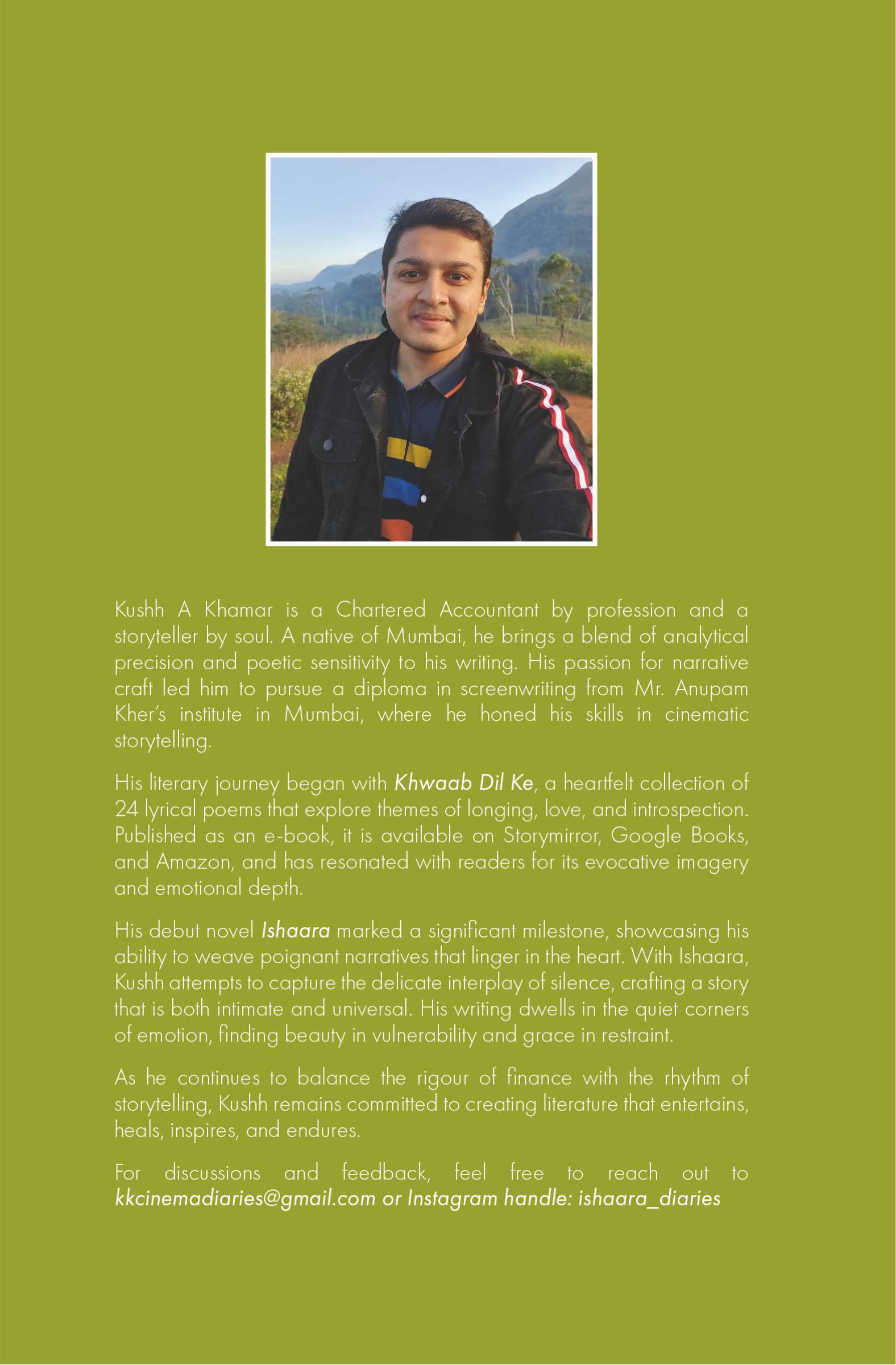 Kushh A Khamar is a Chartered Accountant by profession and a storyteller by soul. A native of Mumbai, he blends analytical precision with poetic sensitivity in his writing. Trained in screenwriting under Mr. Anupam Kher, Kushh brings cinematic depth and emotional nuance to his narratives.
