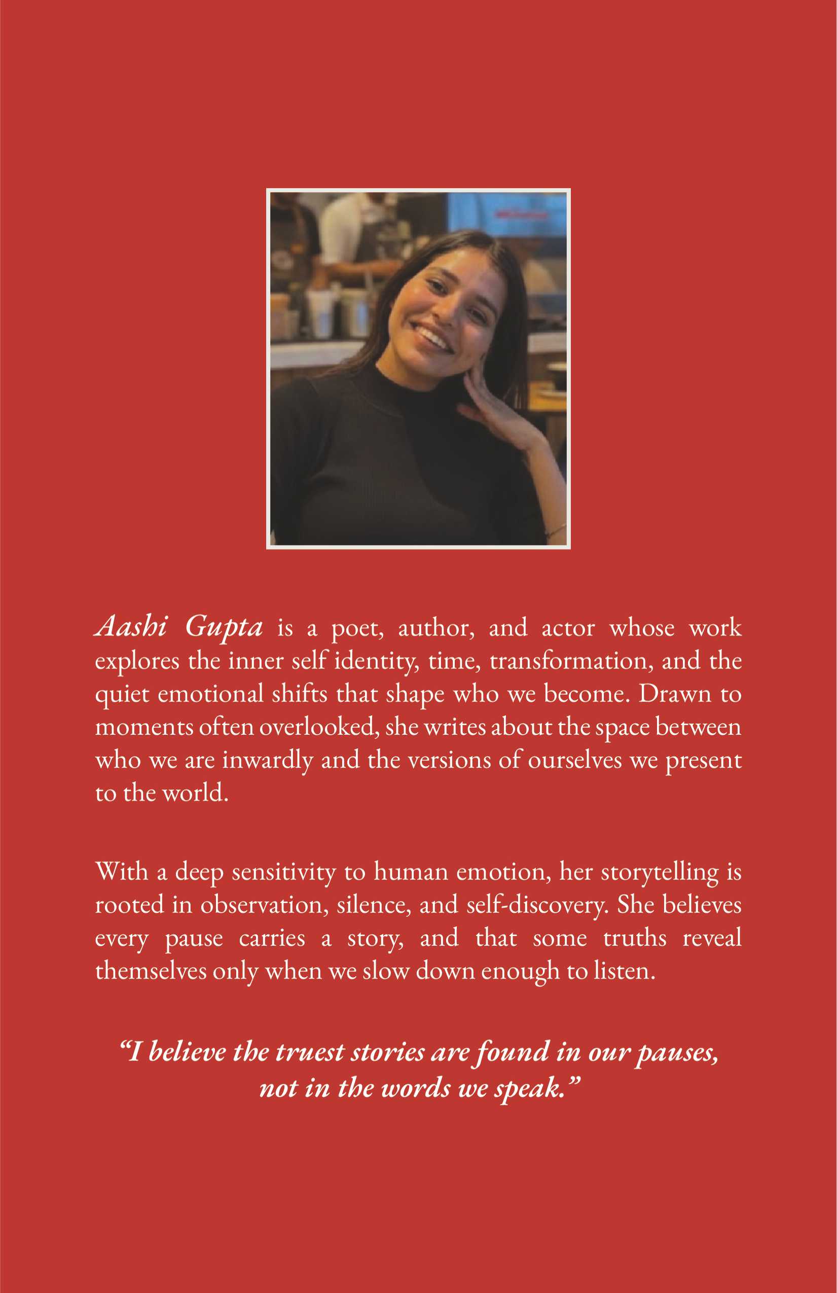 Aashi Gupta is a poet, author, and actor whose work explores identity, time, transformation, and the quiet emotional shifts that shape who we become. Drawn to overlooked moments and the space between who we are and who we present to the world, she writes with deep sensitivity and observation.