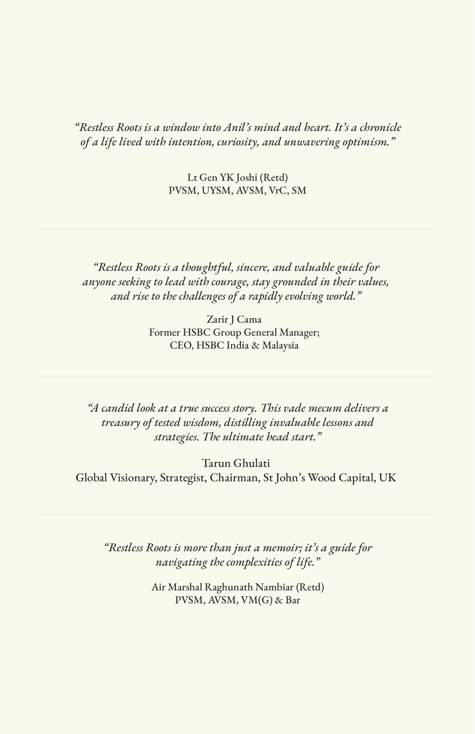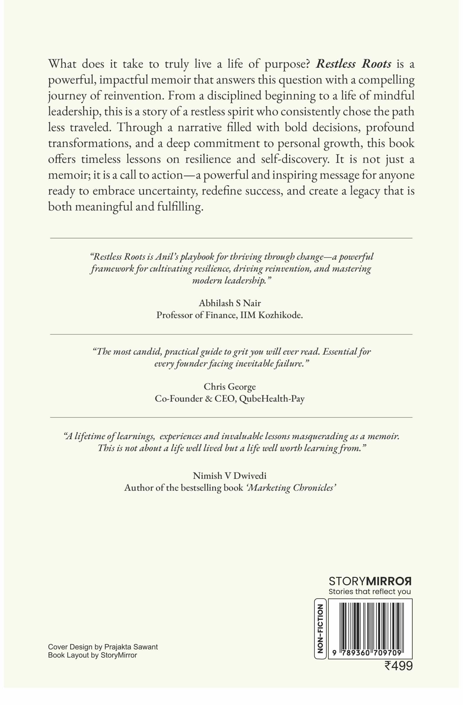 What does it take to truly live a life of purpose? Restless Roots is a powerful, impactful memoir that answers this question with a compelling journey of reinvention. From a disciplined beginning to a life of mindful leadership, this is a story of a restless spirit who consistently chose the path less traveled. Through a narrative filled with bold decisions, profound transformations, and a deep commitment to personal growth, this book offers timeless lessons on resilience and self-discovery. It is not just a memoir; it is a call to action—a powerful and inspiring message for anyone ready to embrace uncertainty, redefine success, and create a legacy that is both meaningful and fulfilling.