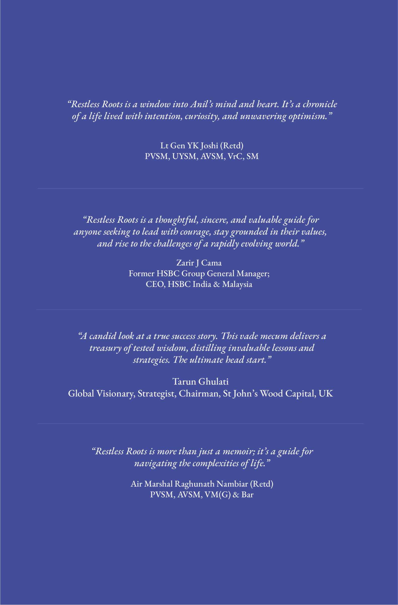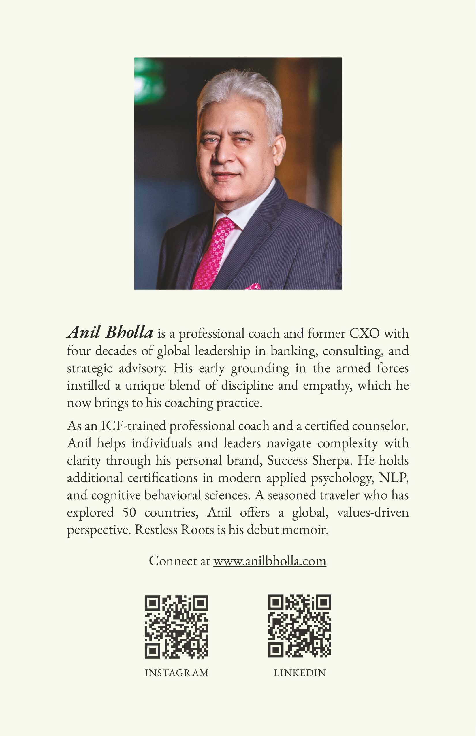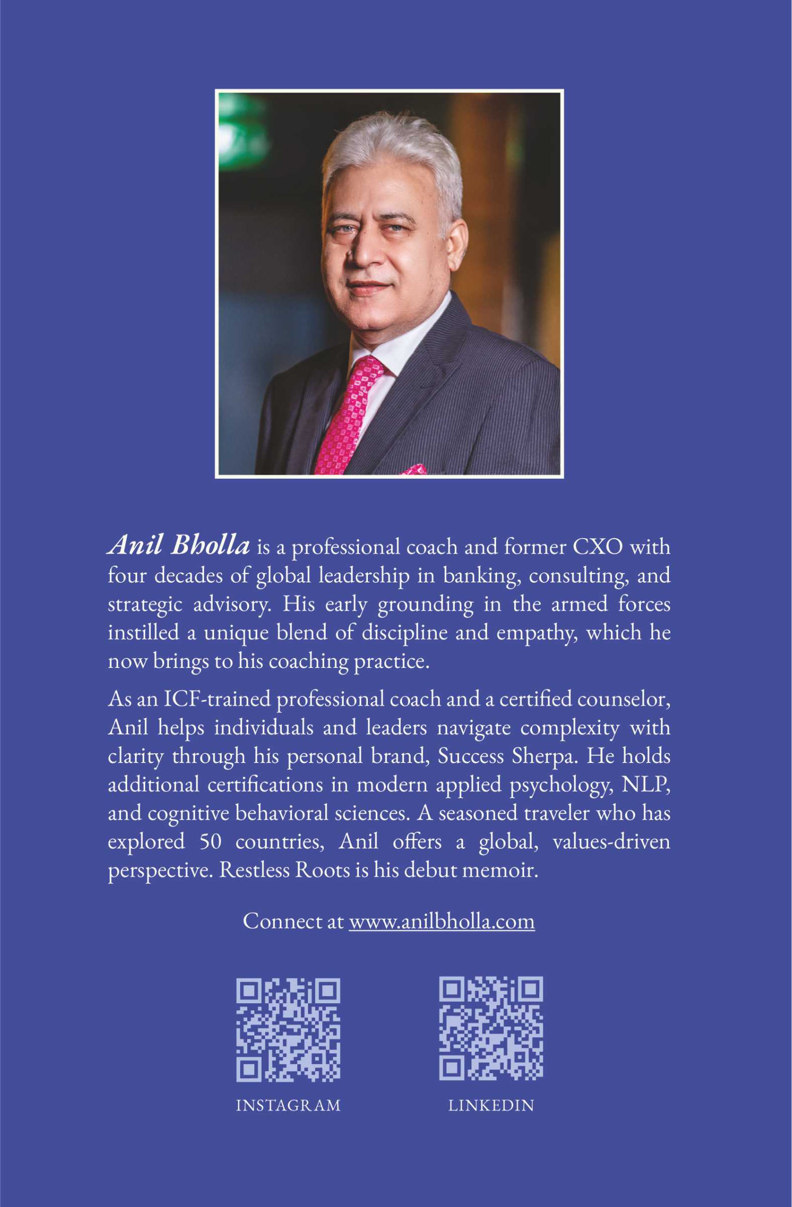 As an ICF-trained professional coach and a certified counselor, Anil helps individuals and leaders navigate complexity with clarity through his personal brand, Success Sherpa. He holds additional certifications in modern applied psychology, NLP, and cognitive behavioral sciences. A seasoned traveler who has explored 50 countries, Anil offers a global, values-driven perspective. Restless Roots is his debut memoir.