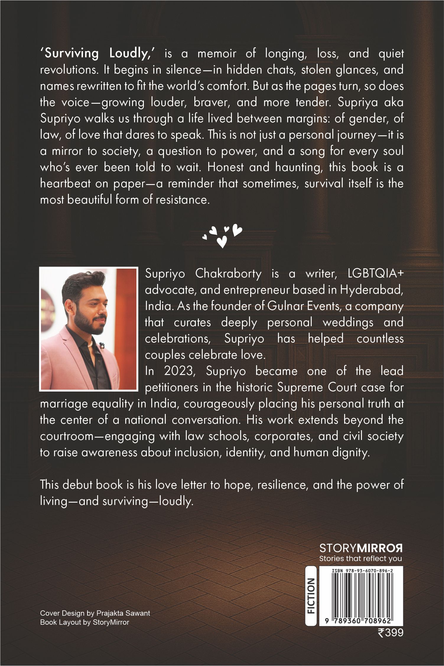 Surviving Loudly is a powerful memoir that chronicles a life lived between the lines—of gender, of law, of longing, and of love that refuses to stay silent. It begins in secrecy: hushed conversations, coded names, and glances hidden from the world. But as the story unfolds, so does the voice—growing clearer, bolder, and more truthful.