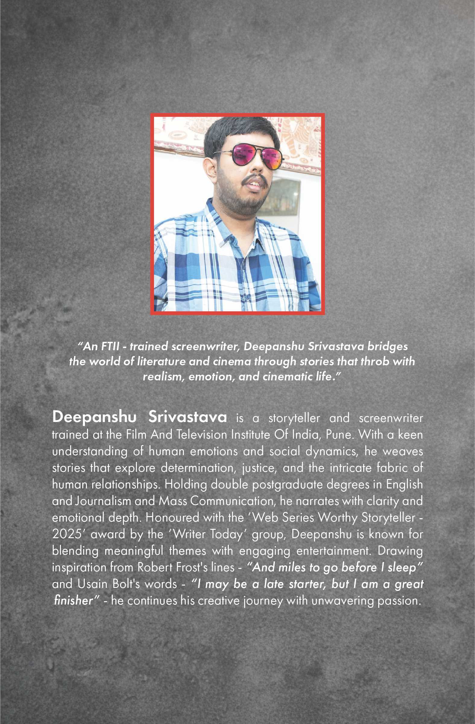 Deepanshu Srivastava is an FTII-trained screenwriter and storyteller who blends literature with cinematic storytelling. A postgraduate in English and Journalism & Mass Communication, he writes stories rooted in realism, emotion, and social dynamics.
