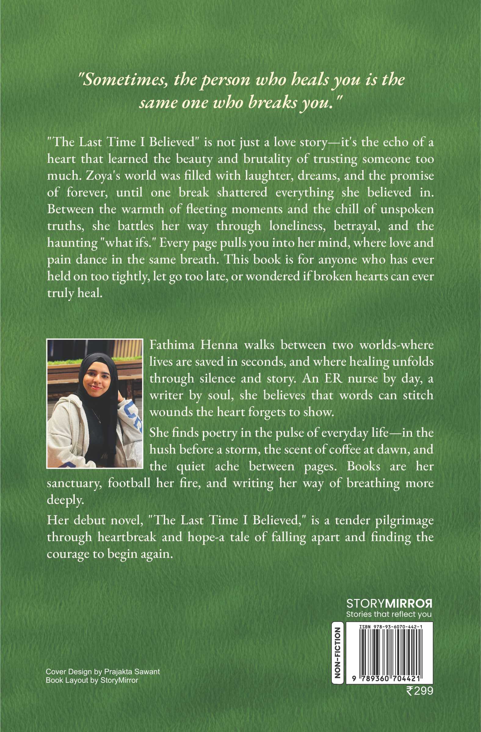 "The Last Time I Believed" is not just a love story — it’s the echo of a heart that learned the beauty and brutality of trusting someone too much. Zoya’s world was filled with laughter, dreams, and the promise of forever, until one break shattered everything she believed in. Between the warmth of fleeting moments and the chill of unspoken truths, she battles her way through loneliness, betrayal, and the haunting “what ifs.” Every page pulls you into her mind, where love and pain dance in the same breath. This book is for anyone who has ever held on too tightly, let go too late, or wondered if broken hearts can ever truly heal.