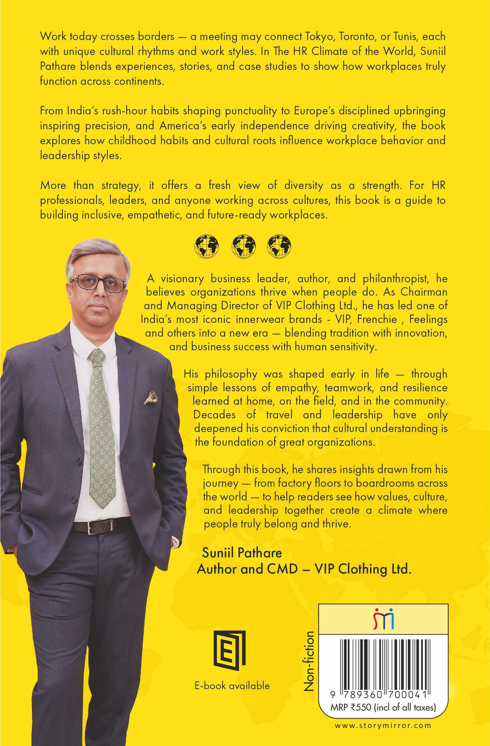 “The HR Climate of the World” is an exceptional global study of people, culture and leadership across continents. The book highlights how human behaviour, workplace expectations and habits differ from country to country — supported by rich case studies and practical examples. It skillfully connects cultural realities with HR strategy, helping readers understand what truly drives performance in diverse environments. Sunil Pathare has created a valuable resource for industry leaders seeking to build organizations that thrive in a multicultural world."