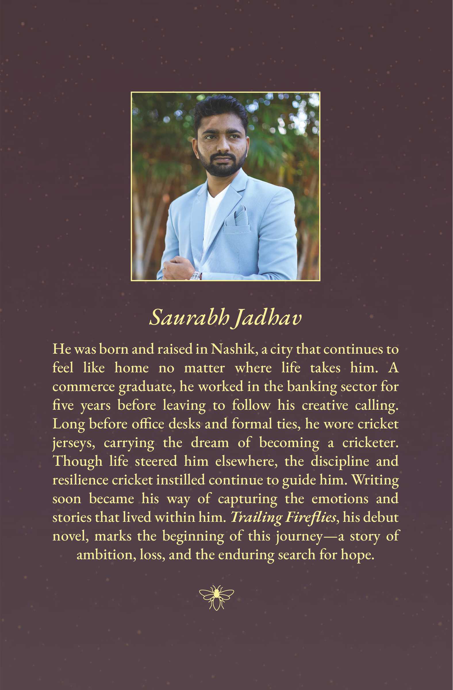 He was born and raised in Nashik, a city that continues to feel like home no matter where life takes him. A commerce graduate, he worked in the banking sector for five years before leaving to follow his creative calling. Long before office desks and formal ties, he wore cricket jerseys, carrying the dream of becoming a cricketer. Though life steered him elsewhere, the discipline and resilience cricket instilled continue to guide him. Writing soon became his way of capturing the emotions and stories that lived within him. Trailing Fireflies, his debut novel, marks the beginning of this journey—a story of ambition, loss, and the enduring search for hope.