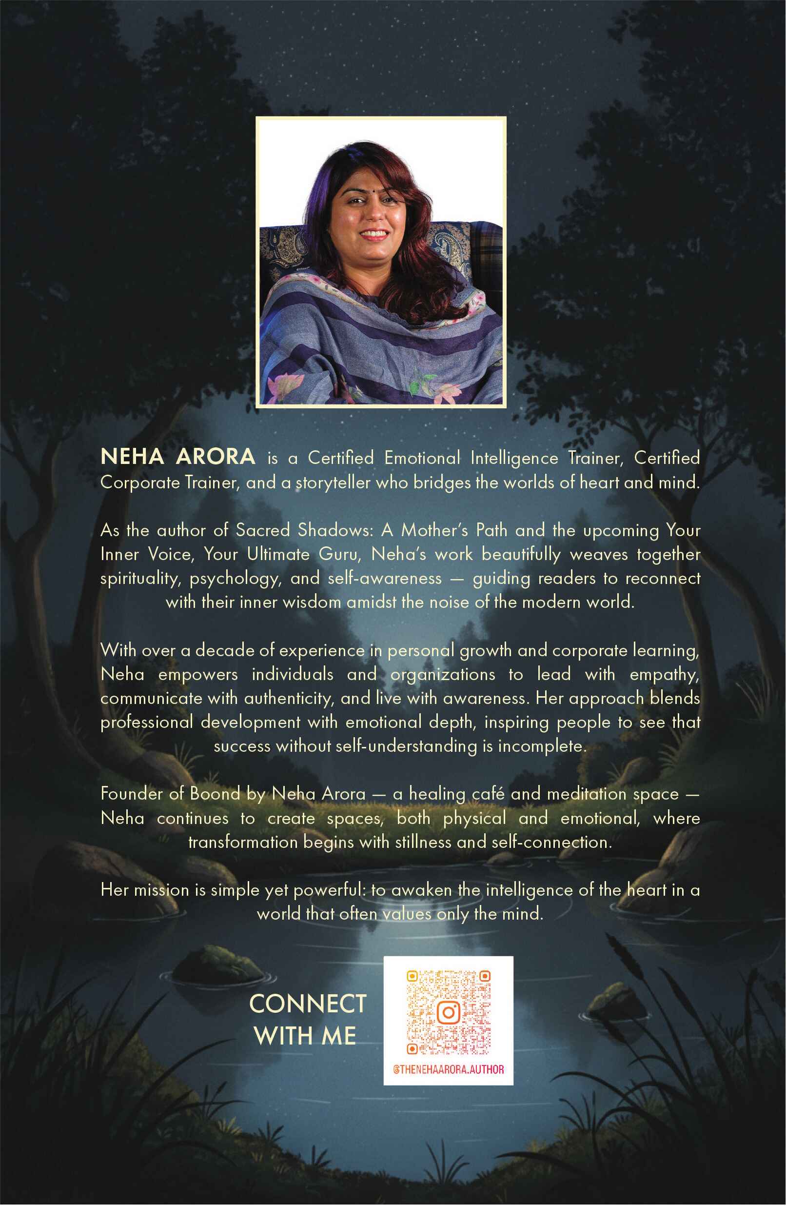 She is the author of Sacred Shadows: A Mother’s Path and founder of Boond by Neha Arora, a healing café and meditation space that encourages reflection, stillness, and emotional wellbeing.