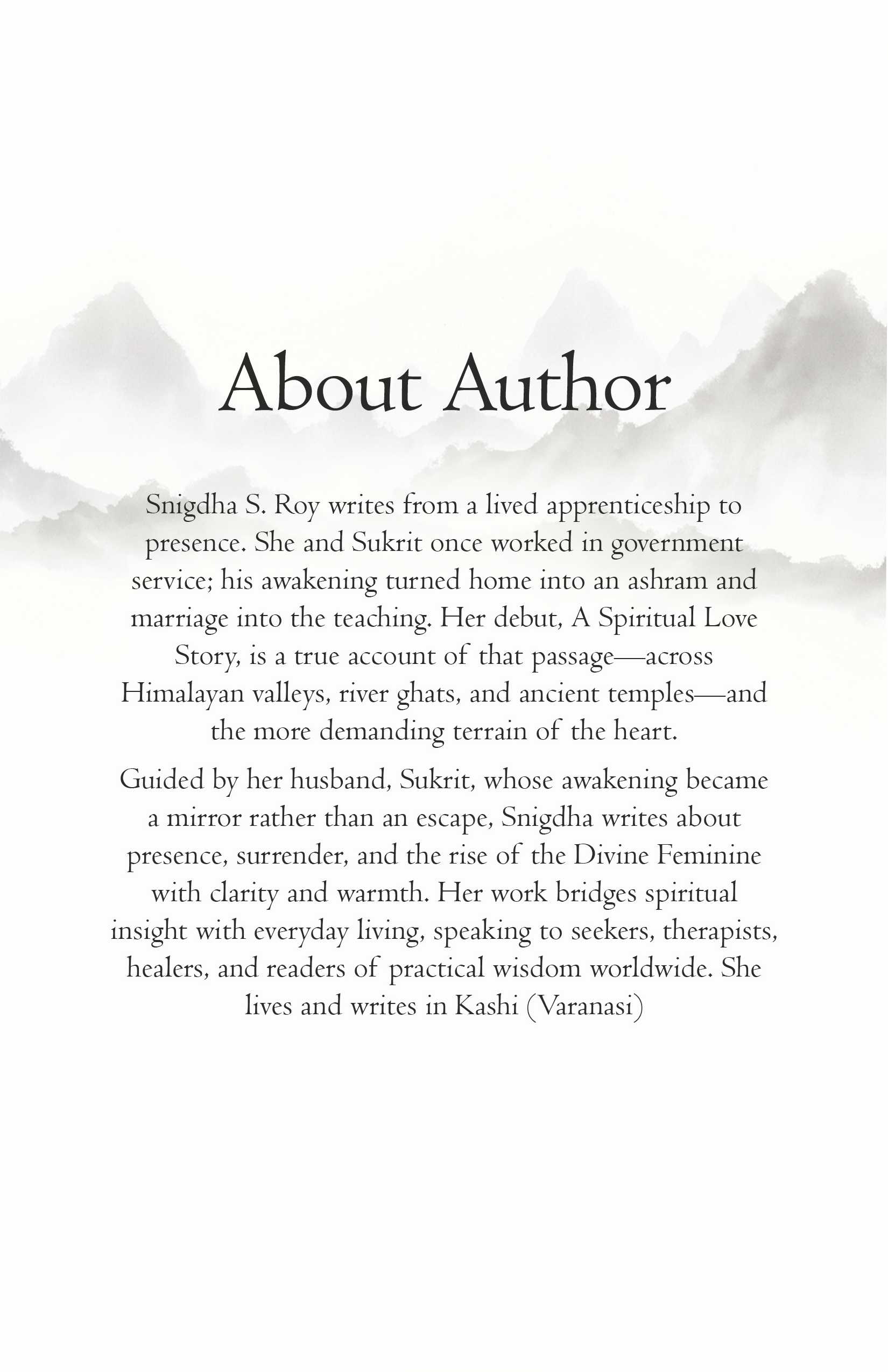 Snigdha S. Roy writes from a lived apprenticeship to presence. She and Sukrit once worked in government service; his awakening turned home into an ashram and marriage into the teaching. Her debut, A Spiritual Love Story, is a true account of that passage—across Himalayan valleys, river ghats, and ancient temples—and the more demanding terrain of the heart.