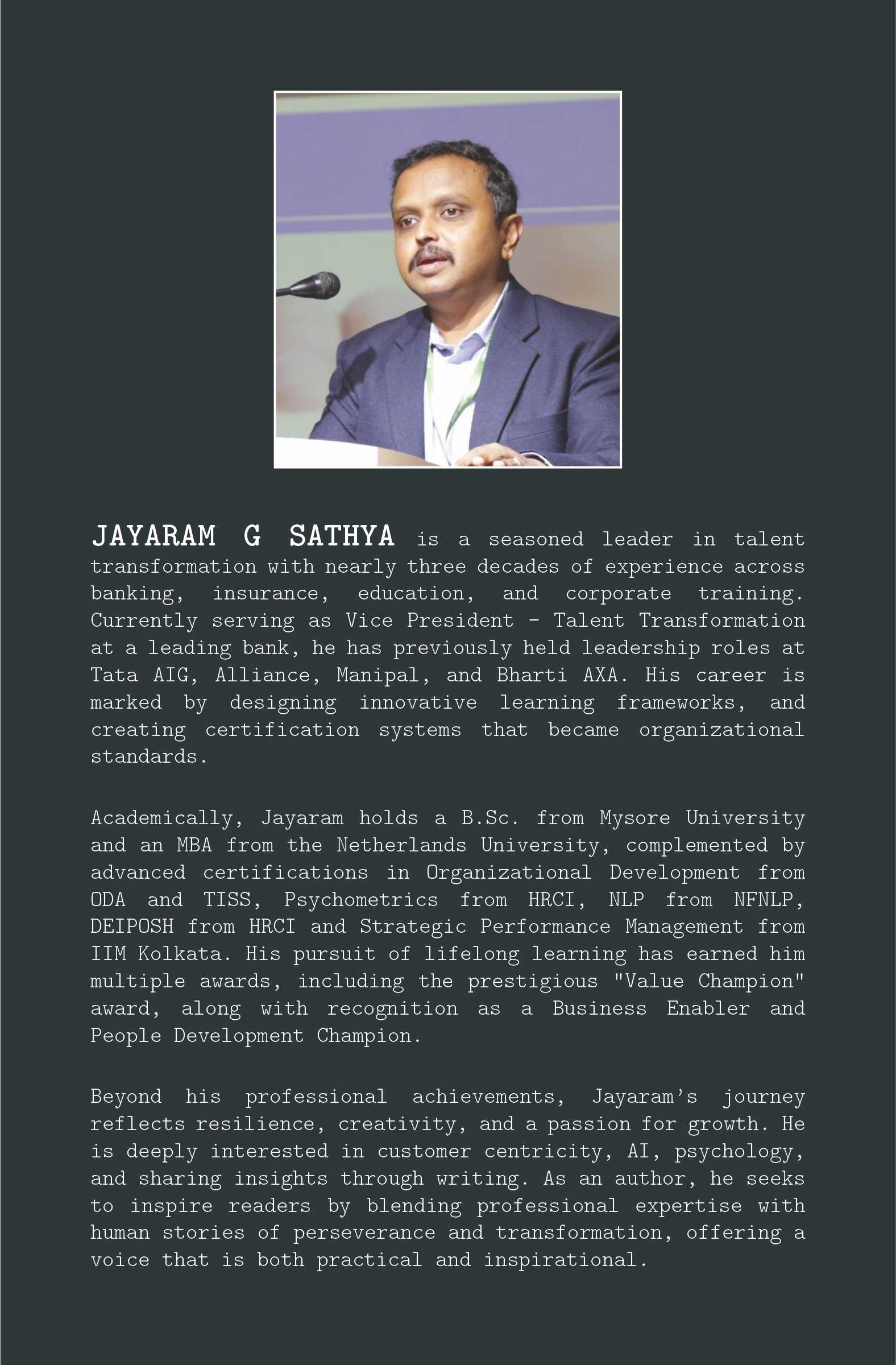 Jayaram G Sathya is not just a storyteller—he is a seasoned leader in talent transformation with nearly three decades of experience across banking, insurance, and corporate training.