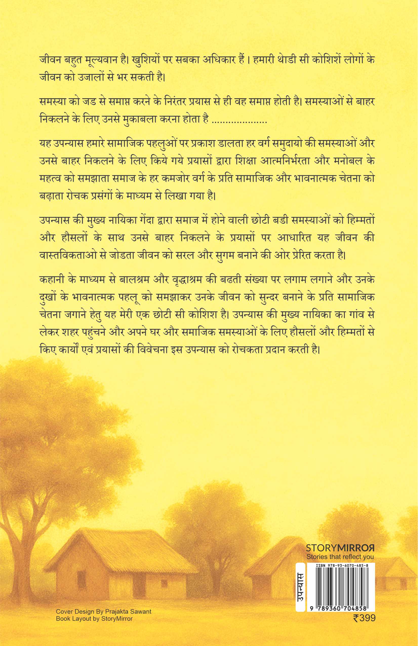 यह उपन्यास हमारे सामाजिक पहलुओं पर प्रकाश डालता हर वर्ग समुदायो की समस्याओं और उनसे बाहर निकलने के लिए किये गये प्रयासों द्वारा शिक्षा आत्मनिर्भरता और मनोबल के महत्व को समझाता समाज के हर कमजोर वर्ग के प्रति सामाजिक और भावनात्मक चेतना को बढ़ाता रोचक प्रसंगों के माध्यम से लिखा गया है।