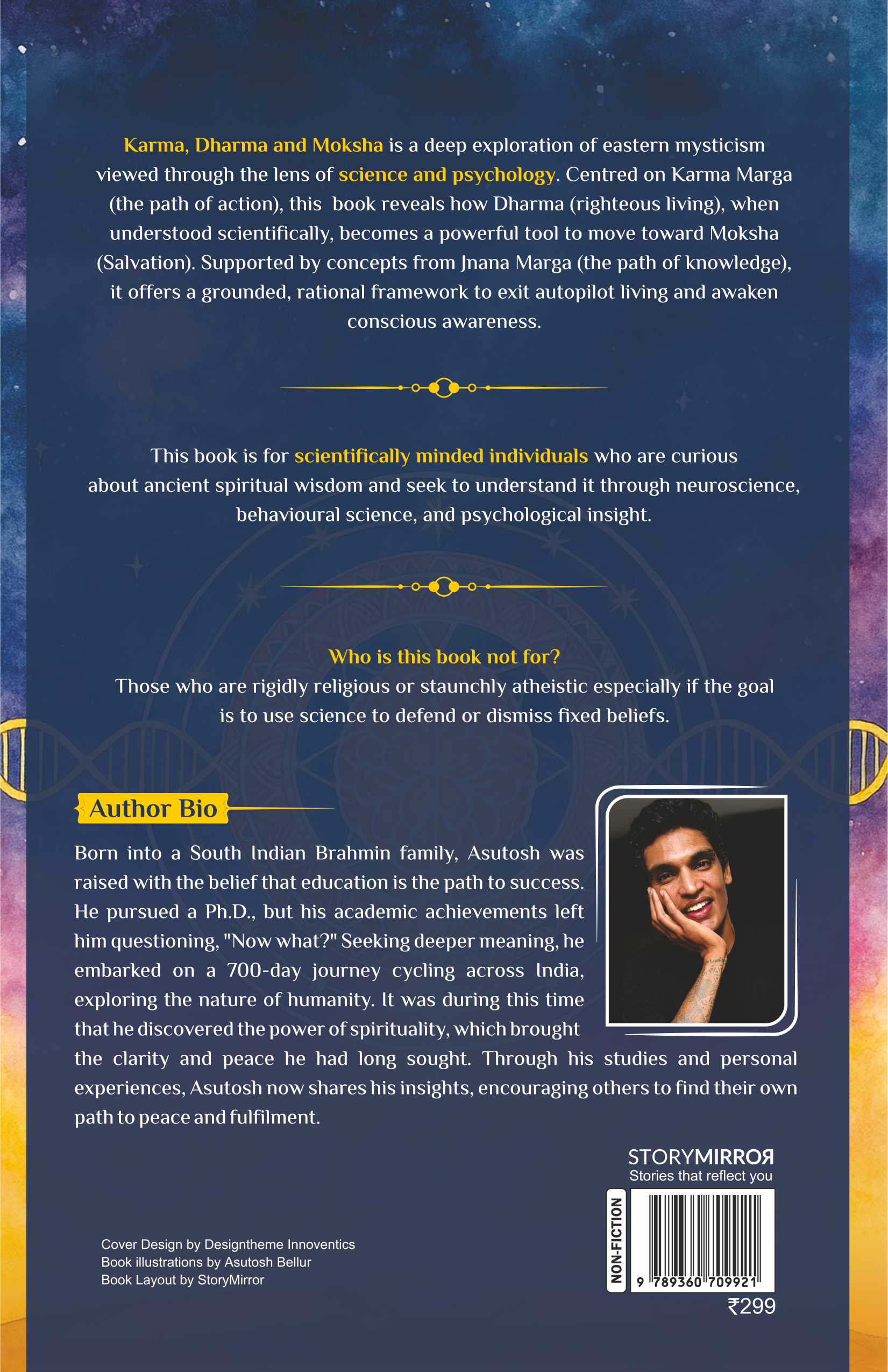Karma, Dharma and Moksha is a deep exploration of eastern mysticism viewed through the lens of science and psychology. Centred on Karma Marga (the path of action), this book reveals how Dharma (righteous living), when understood scientifically, becomes a powerful tool to move toward Moksha (Salvation). Supported by concepts from Jnana Marga (the path of knowledge), it offers a grounded, rational framework to exit autopilot living and awaken conscious awareness.